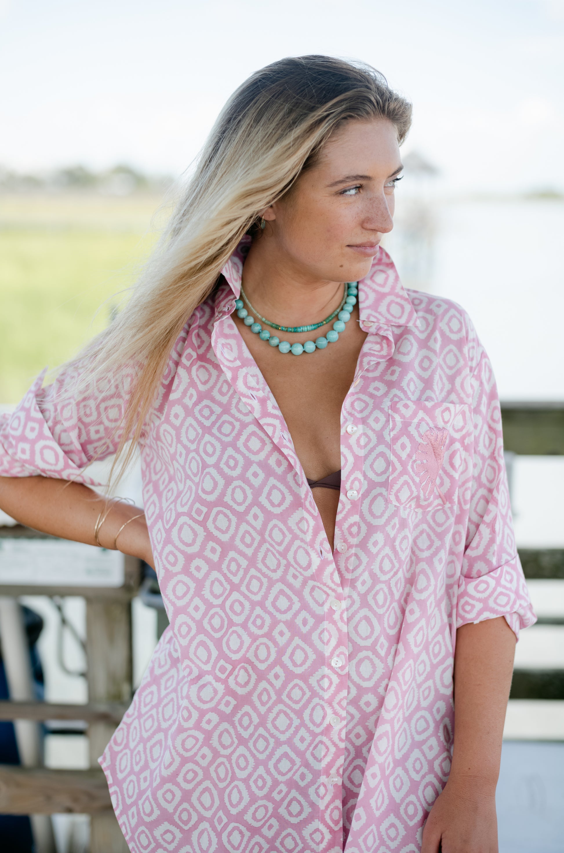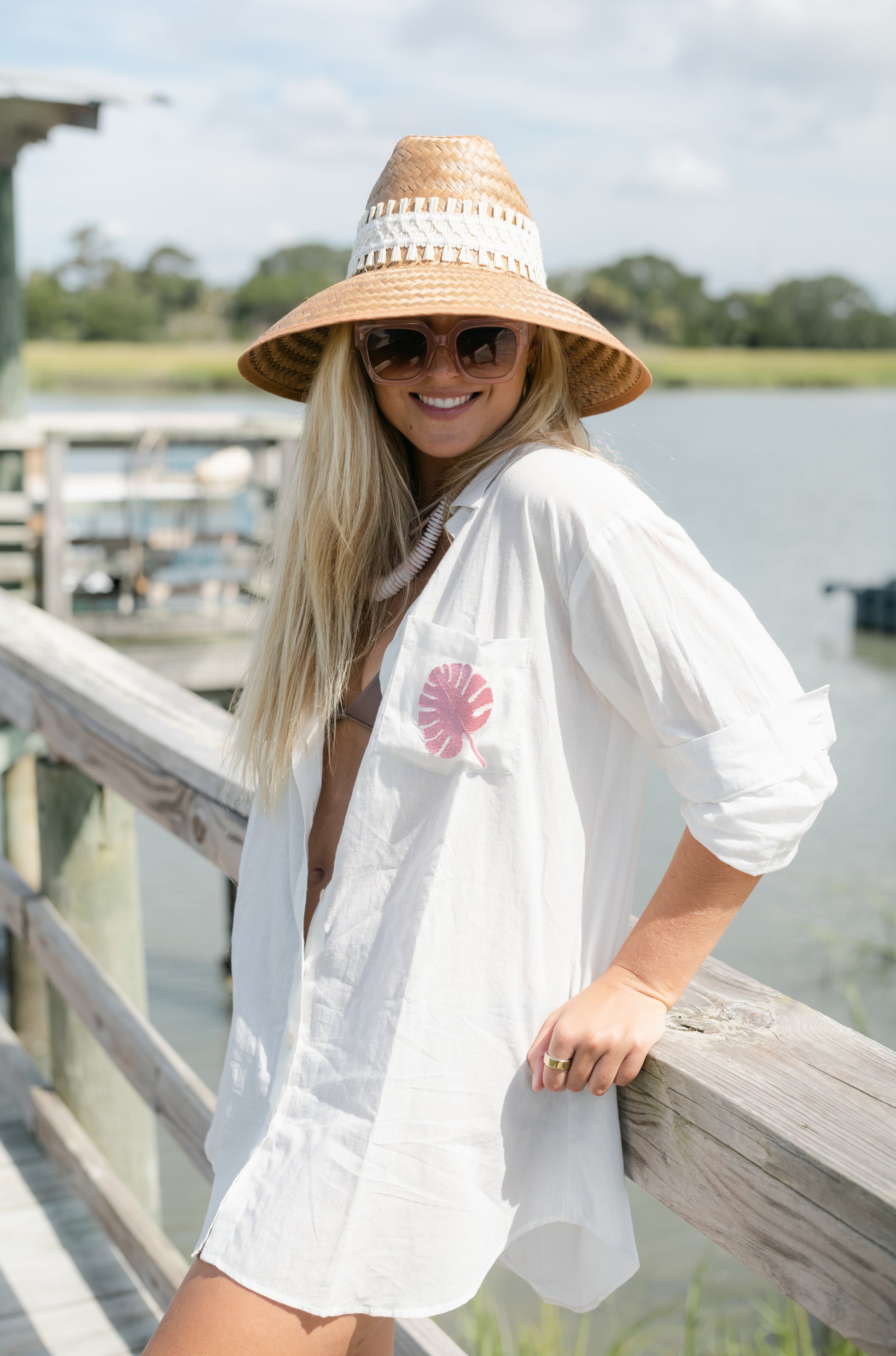 Classic button down, collared shirt with leaf embroidery on pocket. Pairs well with our pareo and sarong. Always pop your collar!